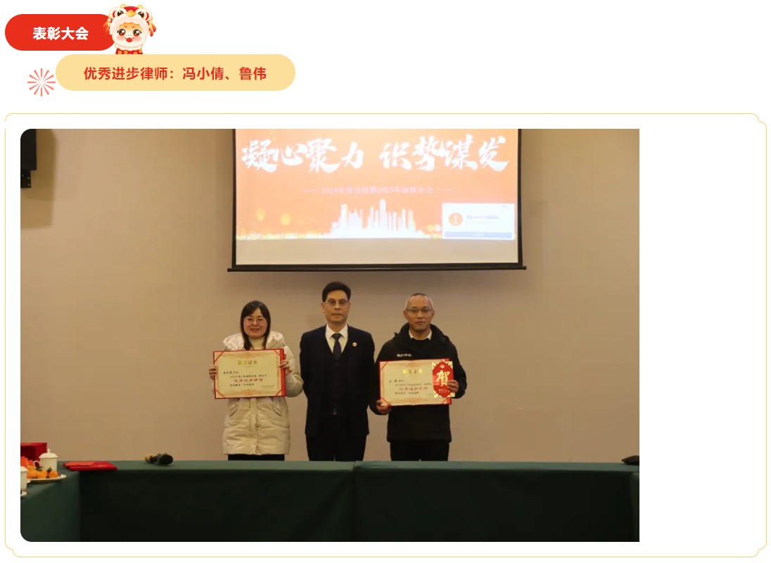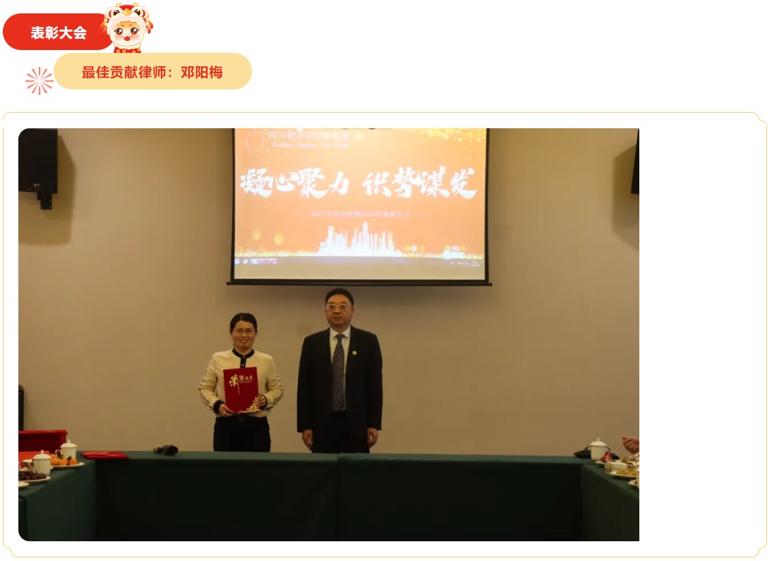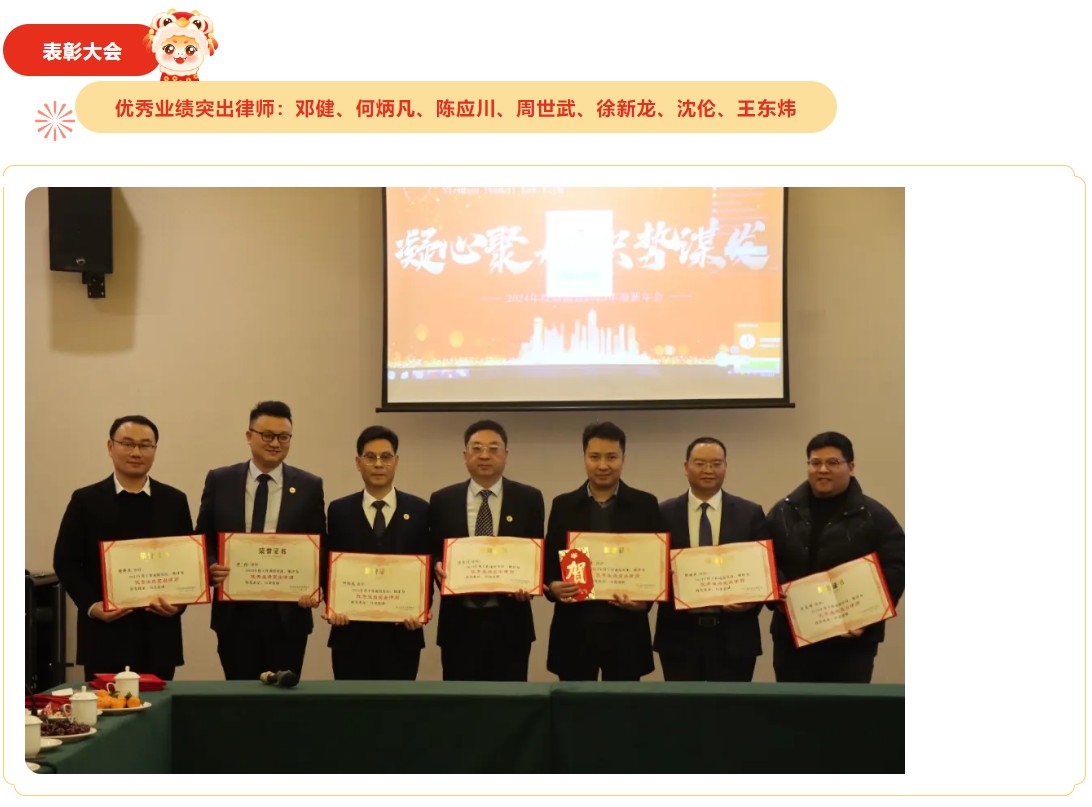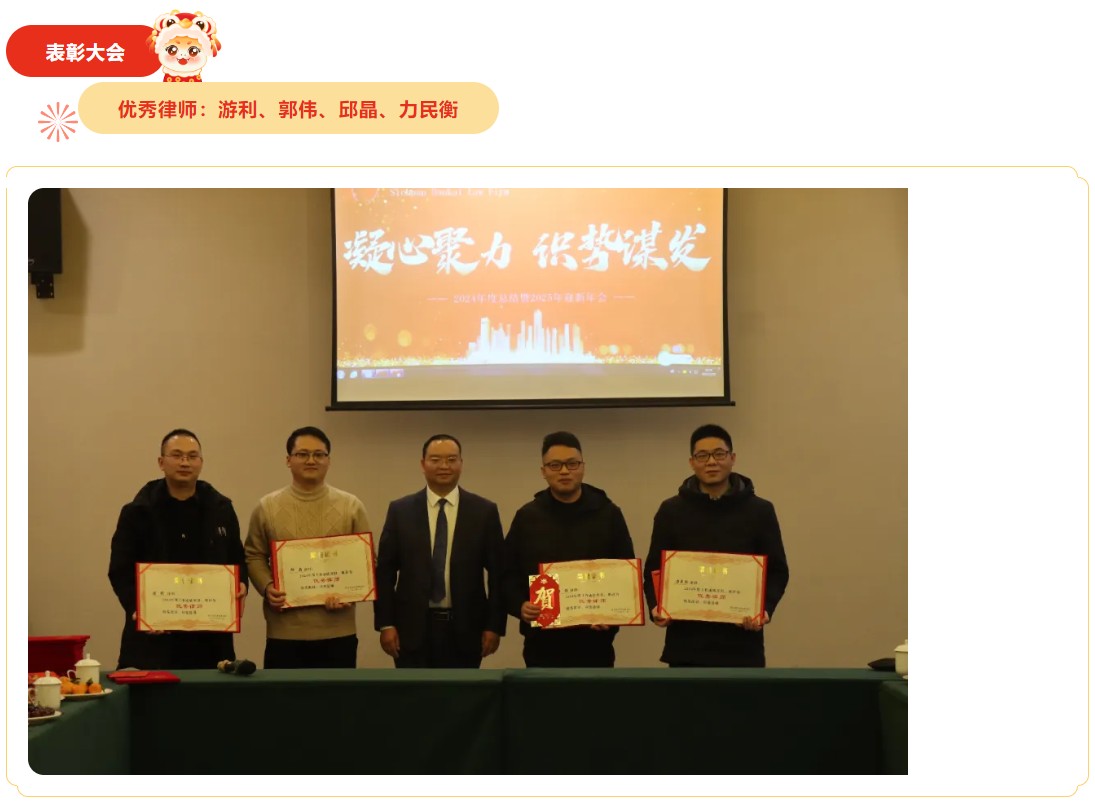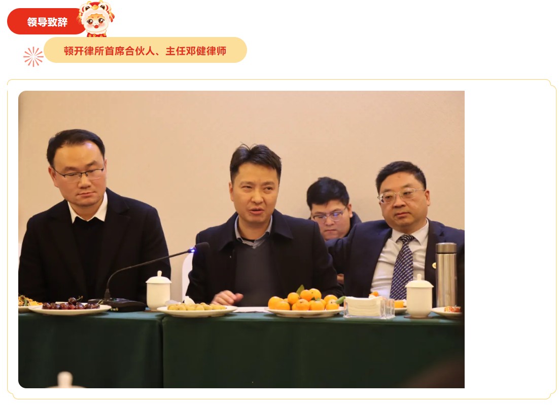 祥龙辞旧岁,金蛇启新程。2025年1月18日下午,四川顿开律师事务所“凝心聚力、识势谋发”主题年会,在禧满鸿福大酒店隆重举行。本次年会由邓健律师主持,顿开邻水办公室和顿开重庆办公室全体律师和行政辅助人员共50余人参加会议。